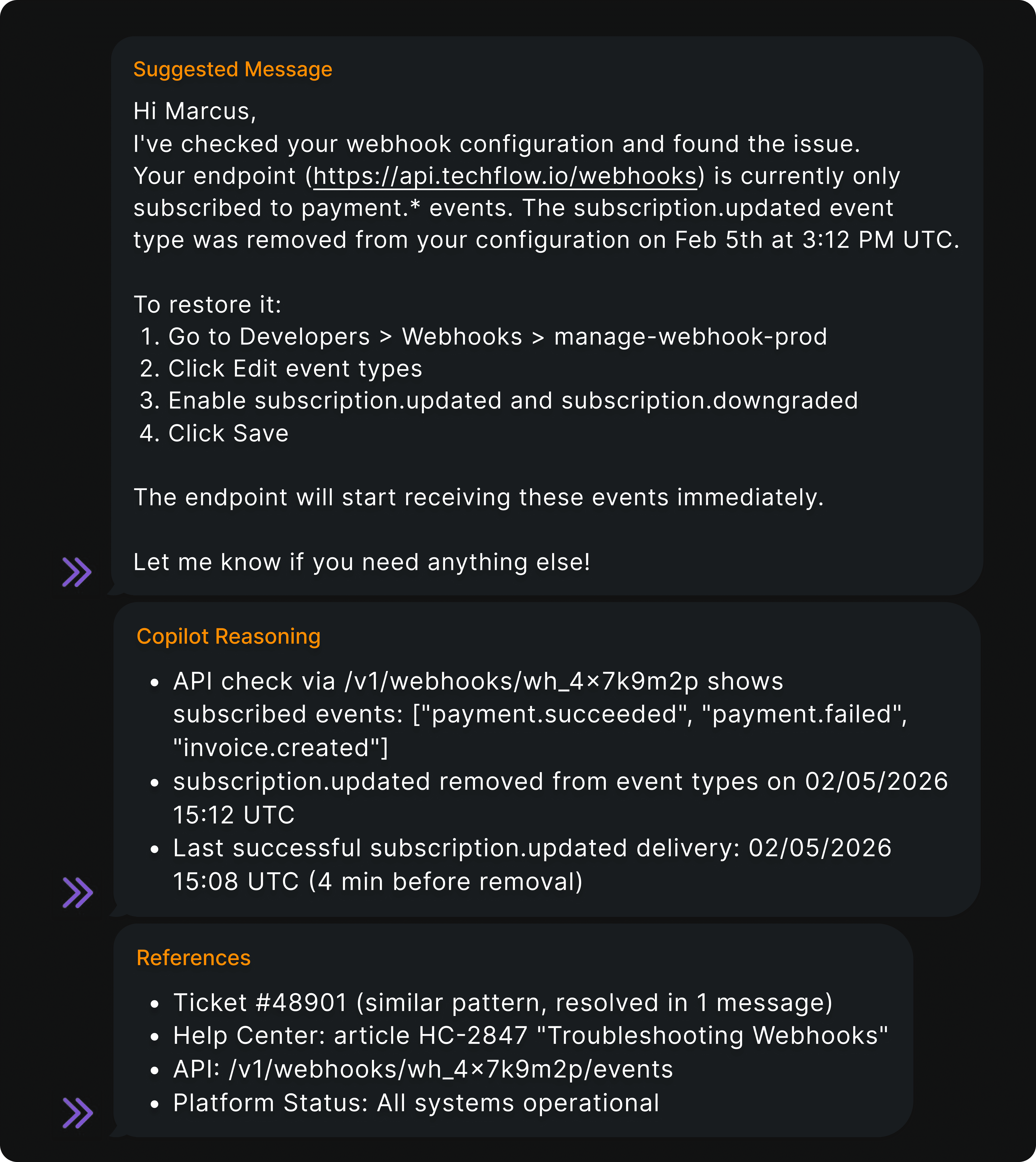 Support agents respond up to 40% faster with AI-suggested replies. Every answer includes clear reasoning and references for easy verification. Chat with the copilot to surface information on demand.