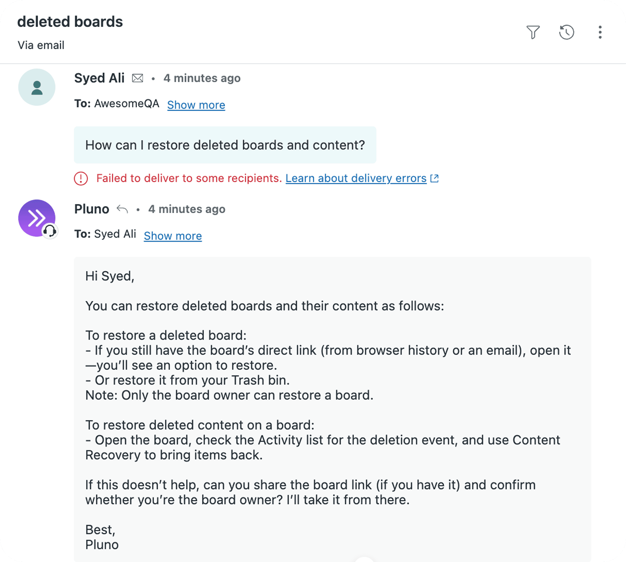When Pluno doesn't have clear evidence for an answer, it escalates safely to your team with full context.