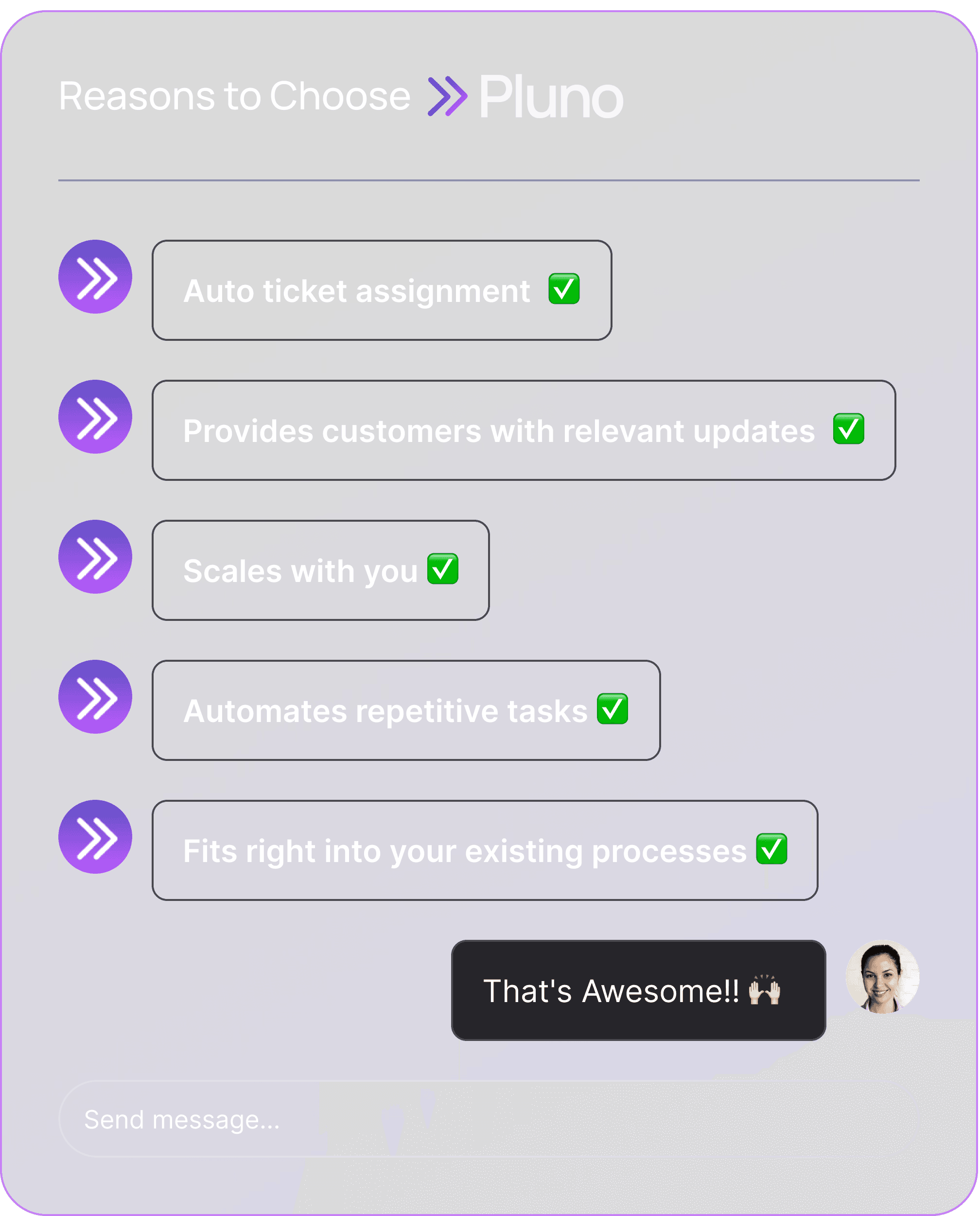 Pluno’s AI grows with you, adapting automatically as ticket volume increases - without adding overhead. And because it comes packed with powerful integration capabilities, you won’t have to worry about your support tools falling behind as your business scales. Everything stays connected, efficient, and ready to grow with you.