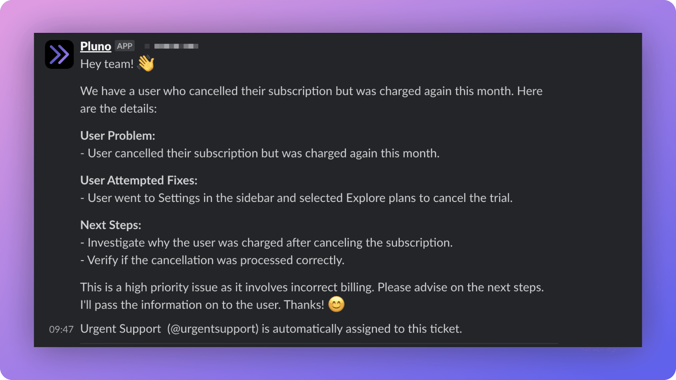 We’ve all been there - scrolling through endless chat logs, trying to piece together what’s going on. Pluno saves you the trouble by creating automated ticket summaries that provide a detailed record of: