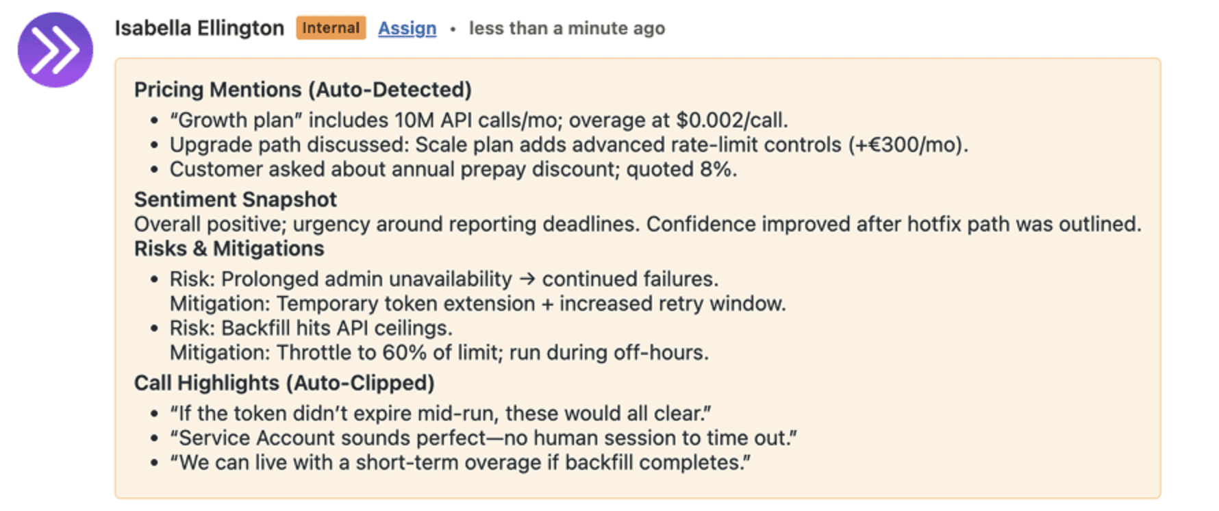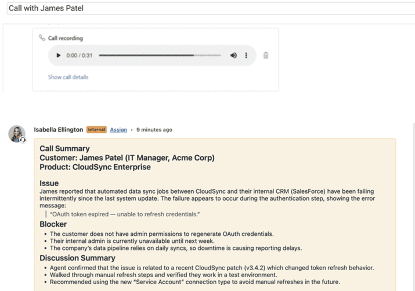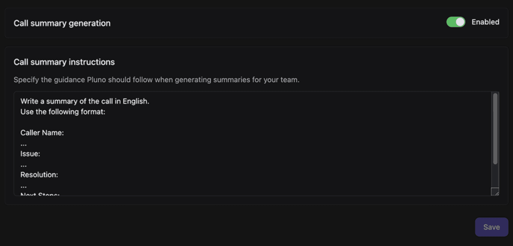 Pluno produces easy-to-read summaries of conversations that highlight key topics and outcomes. Instead of spending minutes or hours listening to call recordings, agents and managers can instantly see the essential parts of a conversation and act with confidence.