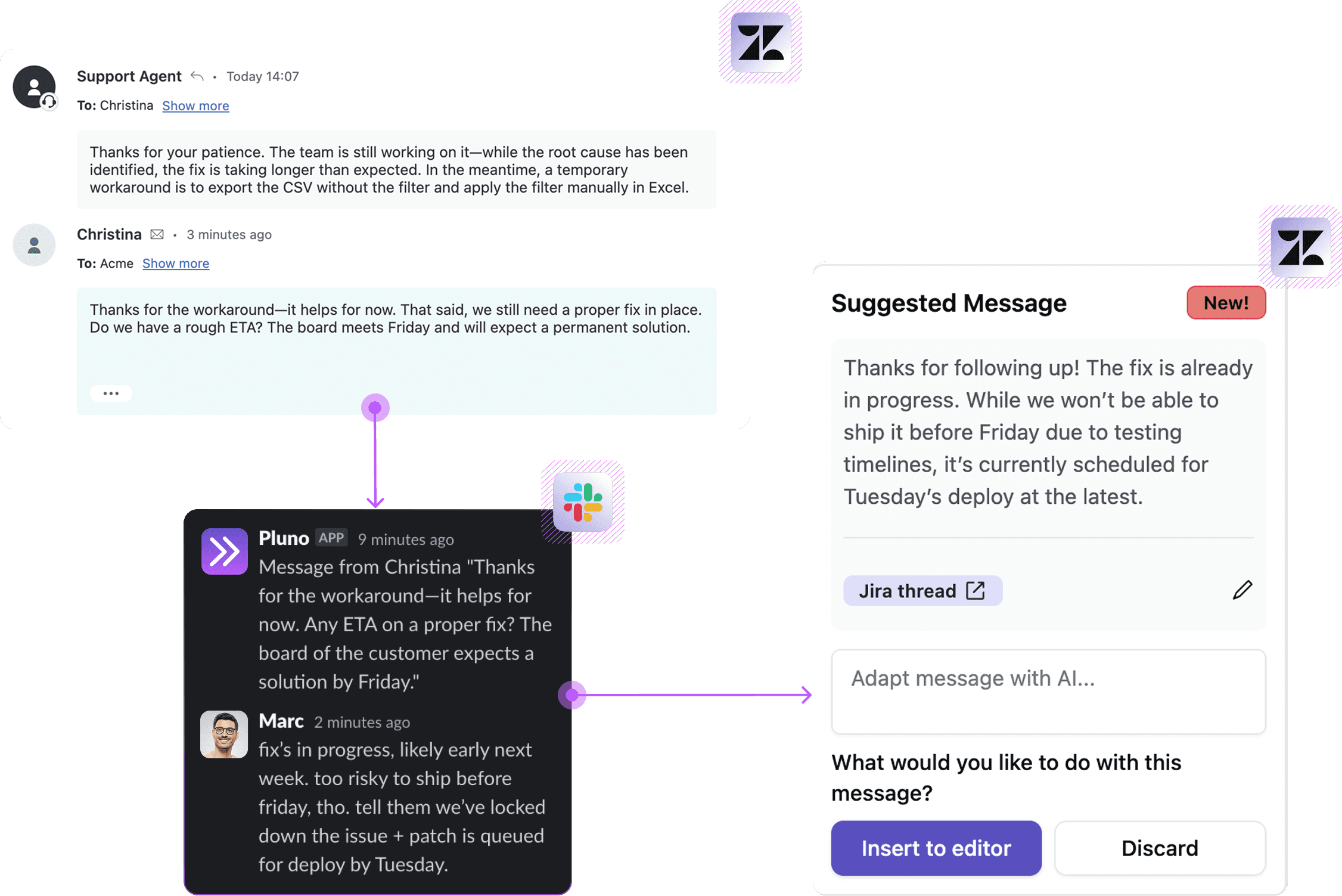 But the moment an issue leaves Zendesk, things slow down. Copying into Jira, pinging in Slack, rewriting, chasing updates, and hoping nothing’s missed—it’s kinda broken. All this happens because the movie is played in Zendesk, but the plot holes are fixed elsewhere. Pluno brings those two worlds together.