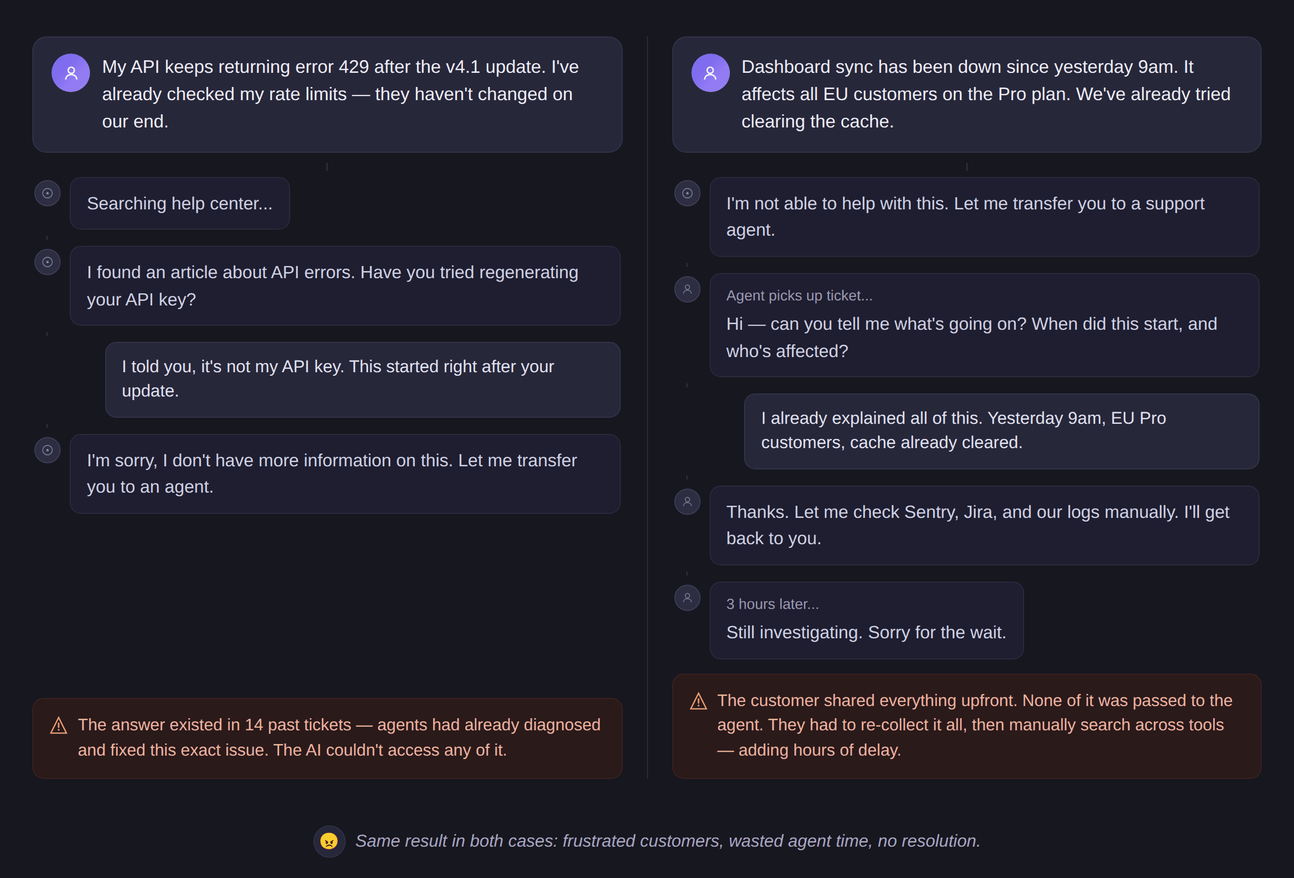 Unresolvable tickets are escalated, often, without the needed context. Then agents have to re-diagnose from scratch, and search across tools to piece things together. Result? No time saved, just shifts the workload. As volume grows, you either hire more or fall behind.