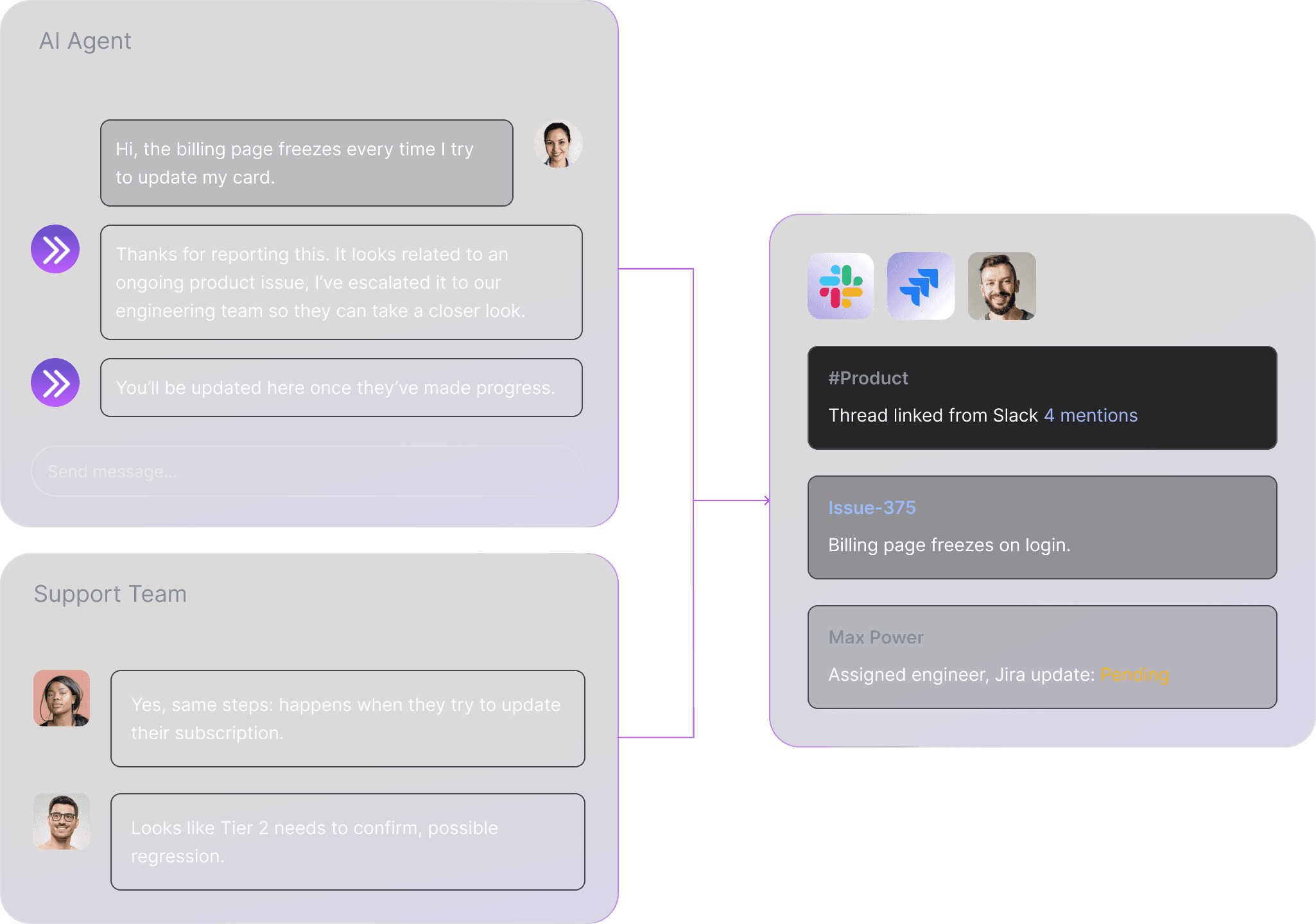 Pluno isn’t just a gatekeeper, it’s omni-present at every stage of support. Whether it’s escalating from your support platform into Jira, surfacing details from Slack threads or feature requests, or joining discussions between engineering and Tier 2, Pluno stays aware and carries the context forward.