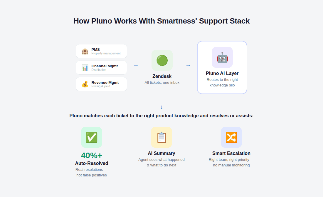 Smartness is a fast-growing lodging tech company supporting thousands of operators worldwide across PMS, channel management, and revenue management. Each product has a small dedicated support team handling heavy volume — often repetitive "How do I…?" questions that already existed in documentation. As volume climbed, first response times drifted into hours. Frustration was building in their customer base, and they needed a solution — but not before learning some painful lessons about what "AI support" really means.