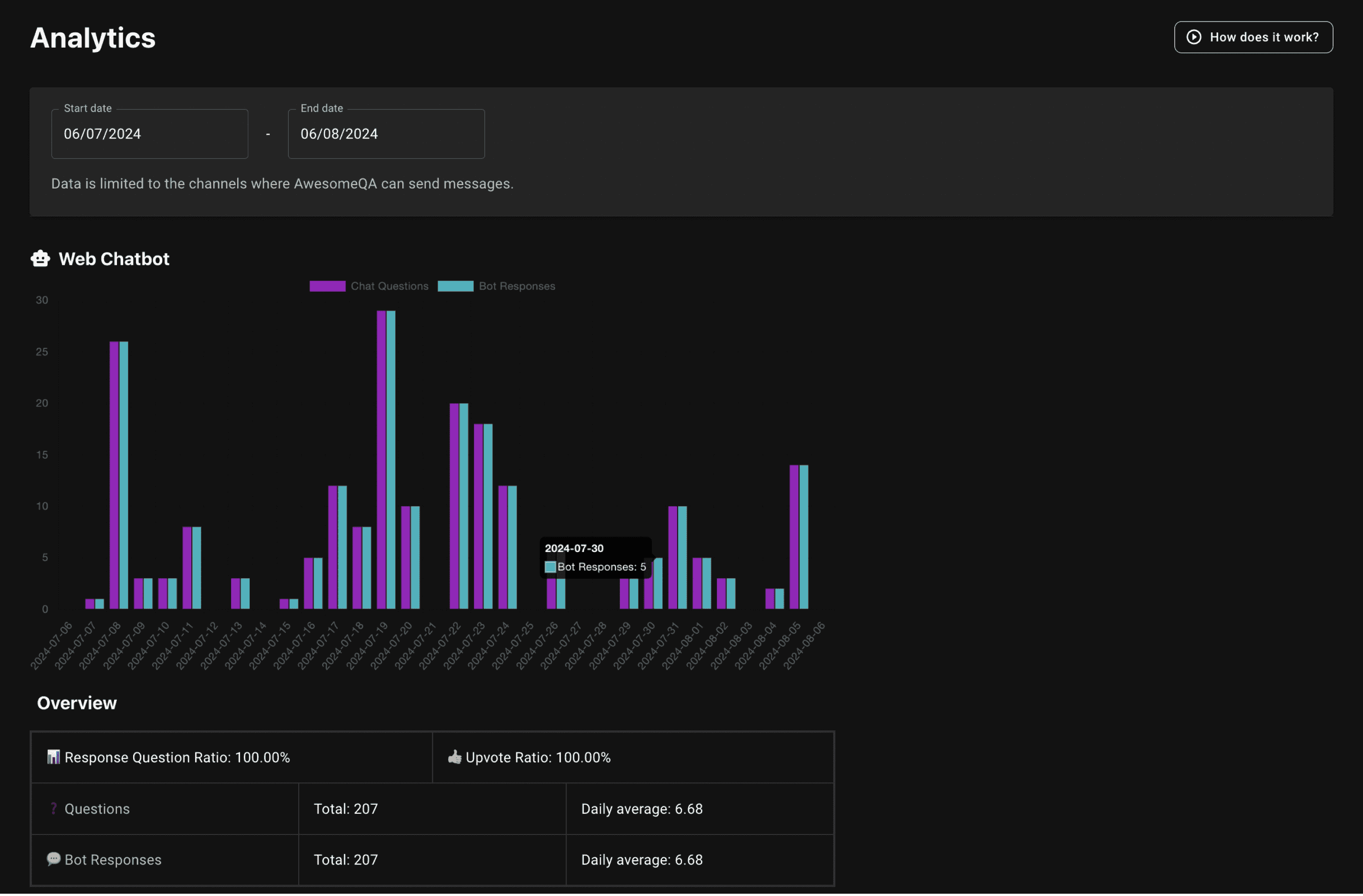 Our intuitive analytics dashboard provides you with a clear overview of all activity. Track the total questions asked and answered to measure engagement. The upvote ratio helps you understand user satisfaction at a glance. See activity trends to monitor what's happening and assess the impact of any active campaigns.